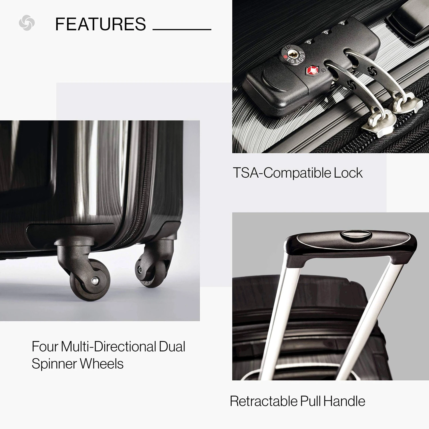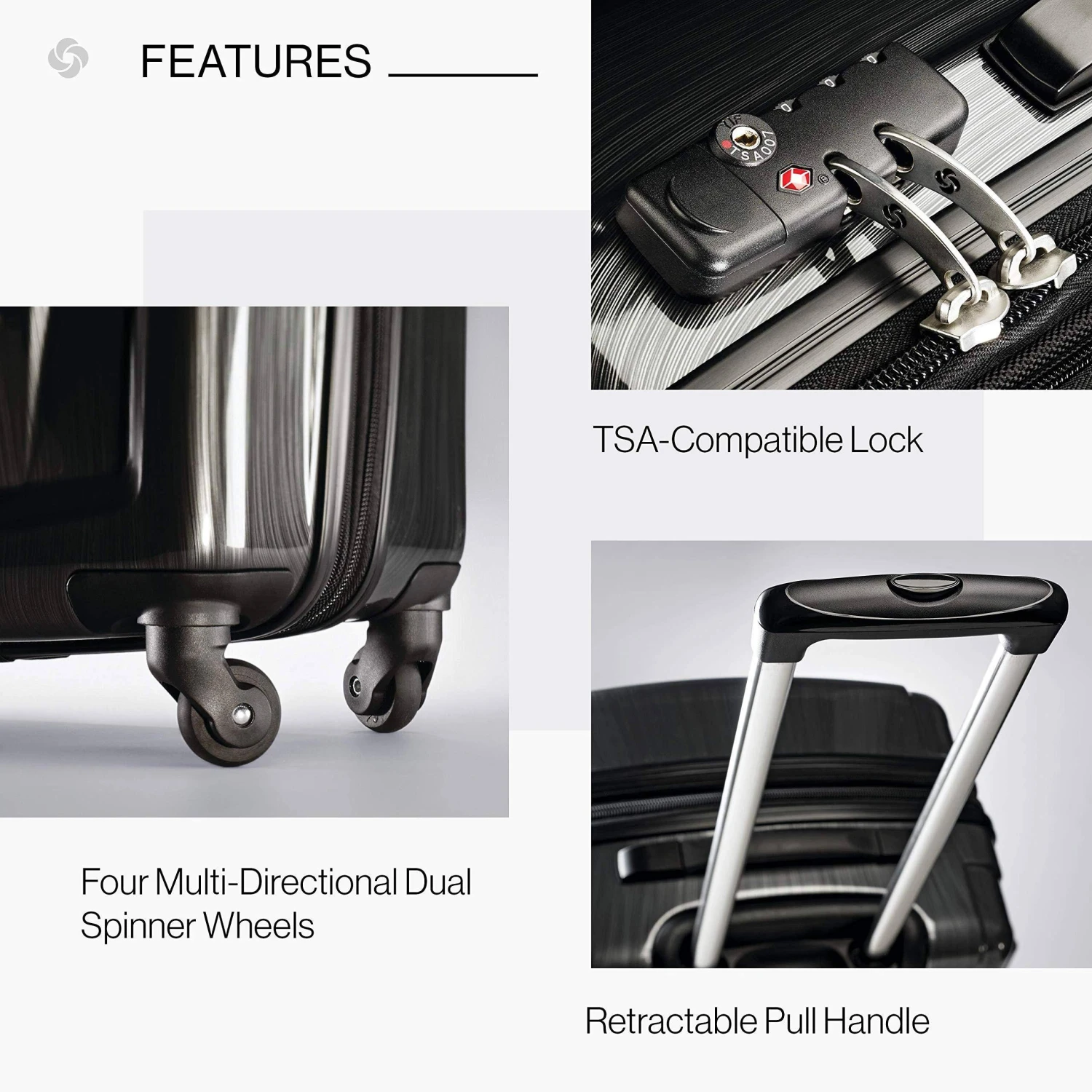 Transport your travel essentials effortlessly and stylishly. This extremely lightweight and durable spinner features 100 percentage polycarbonate construction with sharp molded details. Made to absorb impact by flexing while under stress then popping back to its original shape, eliminating dents and dings while protecting its contents. An elegant brushed pattern hides any potential scratches or scuffs from your journeys. The fully-lined interior has cross-straps, a privacy curtain with its own zippered organizational pockets. Tsa approved combination lock for security and peace of mind.